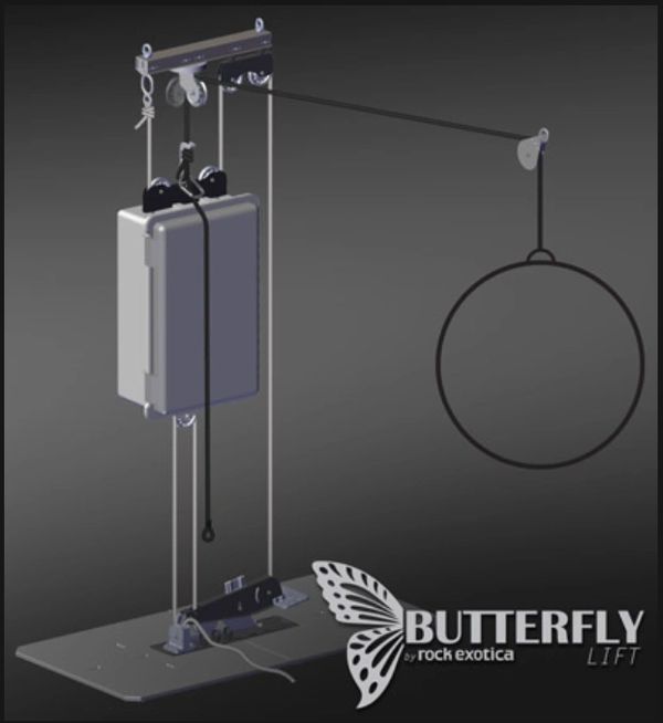 The Rock Exotica’s Butterfly Lift is a portable performer flying system. This system can be set up in almost any venue. The Butterfly lift is a compact manual counterweight system engineered with a 10:1 safety factor and a working load limit of 350 lbs. at 6-8 feet per second. It comes in two configurations that accommodate 40′ and 60′ house height.